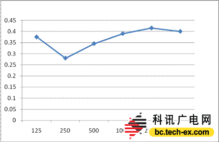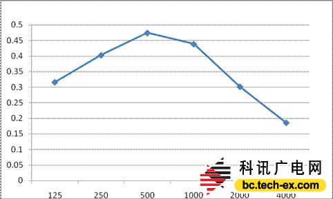 通過測量錄音棚的混響時間曲線如圖10所示,從圖中可以看出房間在2000Hz-4000Hz之間混響時間較短,分別為0.3S和0.18S,同時在125Hz及250Hz的混響時間也相對較短,分別為0.3S及0.4S,在中頻500Hz、1000Hz有著相對較多的混響時間。從整體上看該房間的混響時間特性存在一定的問題主要表現(xiàn)在高頻吸聲過多,中頻混響時間過于突出,勢必影響到主觀的聽覺感受,其本底噪聲在關(guān)燈及關(guān)門的情況下測得為35.5dBA。