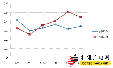 圖13為控制室兩個測試點的混響時間曲線,從圖中可以看出調(diào)音臺錄音師位置的混響時間曲線較為平直,主要集中在0.3-0.35s附近,只是在125Hz附近有0.42s的混響時間,可能是隔聲窗的反射面共振所致。而在控制室中心位置高頻混響時間較高,中低頻部分與測試點1類似,而高頻部分相對較高,有可能為房間內(nèi)家具及柜子玻璃的反射面所致,原因需要進(jìn)一步排除才能確定。