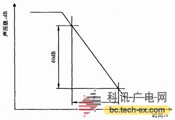 混響時間反映了室內(nèi)聲能的衰變快慢,它是由100多年前美國物理學(xué)家賽賓提出的,指的是當(dāng)聲源在房間內(nèi)停止發(fā)聲后,殘余聲能在房間內(nèi)往復(fù)反射,其密度衰變60dB所需的時間,如圖1所示。我們可以通過賽賓公式