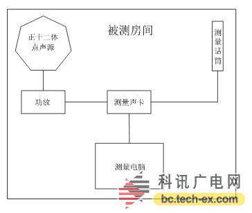 通過上面我們對混響時間的了解,利用脈沖響應(yīng)積分法進(jìn)行測量,其系統(tǒng)可分為聲源、測試話筒、測量軟件三部分,如圖2所示,為脈沖響應(yīng)積分法測量混響時間的測試系統(tǒng)圖。聲音信號通過電腦經(jīng)聲卡由正十二面體點聲源揚聲器發(fā)出,通過對房間的激勵在測量點由測量話筒記錄到電腦,經(jīng)專業(yè)測試軟件進(jìn)行數(shù)字信號處理,最終獲得混響時間。為了更好地激勵房間的聲學(xué)特性,通常測量時對聲源及話筒有一定的要求,其中揚聲器的指向性應(yīng)盡可能接近全指向,且可以提供足夠的聲壓級來滿足聲壓衰減的動態(tài)要求,同時對于測量話筒來說振膜越小越好,最大直徑不能超過26mm。
