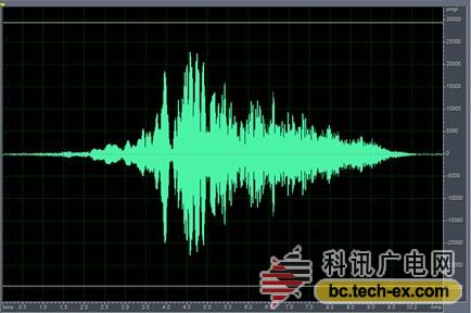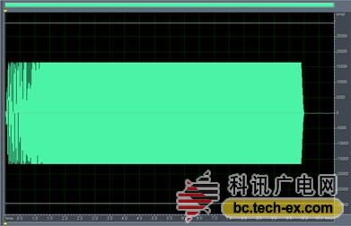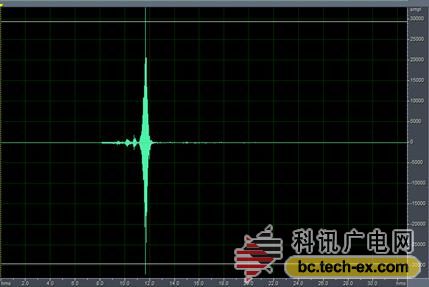 圖3為掃頻信號,作為房間激勵的噪聲信號,頻率為20Hz-20KHz時長為10s,通過該信號與自身的卷積可以獲得脈沖信號,如圖4所示,從圖中可以看出經(jīng)計算得出的脈沖響應(yīng)上升沿陡峭,比直接利用電火花或者扎氣球等方法獲得的脈沖響應(yīng)頻帶寬且信噪比高。
