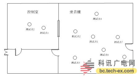 對于話筒測量點數(shù)量方面,通常需要尋找房間里具有代表性的觀眾位置,特別是靠近墻面座位或者包廂的下面,話筒高度距地面通常在1.2米左右,此高度與大部分觀眾坐下時耳朵距地面高度相同。對于工程噪聲為目的的混響時間測量,話筒測量點可以在觀眾區(qū)域中心附近布置相對較少的三到四個點即可。若是對于廳堂混響設(shè)計為目的的測量,通常要根據(jù)房間聲學(xué)環(huán)境的復(fù)雜程度,選擇一定數(shù)量具有代表性的測量點。同時對于聲源的發(fā)聲位置來說也要根據(jù)廳堂日常使用的情況來進(jìn)行變更,通常放置在日常經(jīng)常發(fā)聲的位置,類似舞臺、樂池等位置,針對不同的發(fā)聲位置和使用目的進(jìn)行靈活布點。如圖9所示,首先測量了用戶反應(yīng)較為不理想的區(qū)域,例如錄音棚內(nèi)測試點1-5,同時為了反映整個錄音棚的平均聲學(xué)特征,在測量時另外增加了測試點6-7點。其次對控制室錄音師位置以及房間中心位置進(jìn)行測量,以獲得控制室的混響時間頻域特征。