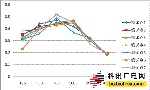 圖11為錄音棚內(nèi)各個測試點的混響時間曲線,從整體來看7條曲線整體趨勢基本相同的,特別是在2000Hz-4000Hz之間有著非常接近的曲線擬合。其中測試點7在500Hz偏離較大,主要原因可能在于測試點門及譜架等反射面形成的低頻駐波所引起的共振。