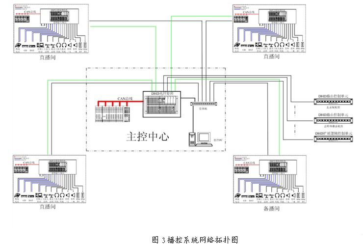 其它需要實(shí)時播出信號的部門,諸如錄制機(jī)房、網(wǎng)絡(luò)播出機(jī)房、有線播出機(jī)房、審聽間等,可以通過DHD路由控制單元使用網(wǎng)線直接連至主控中心的光纖交換矩陣(見圖3中DHD路由控制單元的連接),來獲取所需的播出信號。