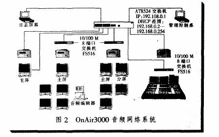為了盡可能發(fā)揮OnAir3000在音頻網(wǎng)絡中的作用,在組網(wǎng)時必須選擇合適的網(wǎng)絡拓撲結(jié)構(gòu)。為保證充裕的帶寬和較低的響應時間,MADI技術(shù)應用于音頻信號的輸人輸出,而直播機房和總控機房之間的互連則通過五類線連接。