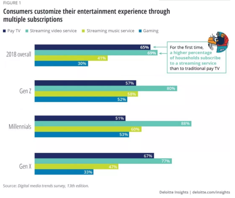 今年,德勤進(jìn)行了第十三次數(shù)字媒體趨勢(shì)調(diào)查,報(bào)告指出用戶正通過越來越多的訂閱渠道滿足自己的娛樂體驗(yàn),獲取自己喜歡的內(nèi)容。付費(fèi)電視、流媒體視頻、音樂和游戲這幾個(gè)領(lǐng)域是用戶最常關(guān)注的領(lǐng)域。