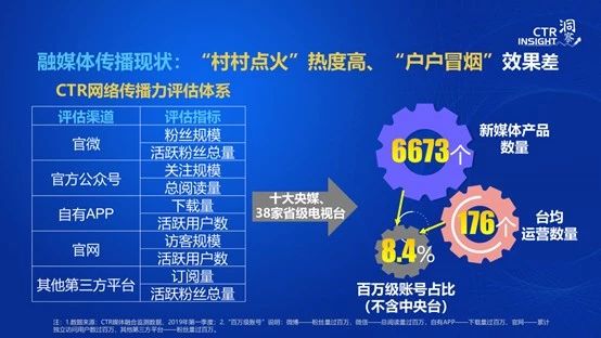 2018年,CTR對(duì)38家電視臺(tái)、十大央媒的融媒體傳播力進(jìn)行了盤點(diǎn),形成了CTR網(wǎng)絡(luò)傳播力評(píng)估體系。在針對(duì)五大渠道的評(píng)估體系當(dāng)中,我們把主要央媒和電視臺(tái)的新媒體產(chǎn)品進(jìn)行了梳理,發(fā)現(xiàn)賬號(hào)數(shù)量達(dá)到6000~8000個(gè),數(shù)量非常巨大,臺(tái)均運(yùn)營數(shù)量176個(gè)。