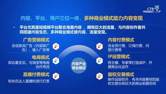 內(nèi)容、平臺(tái)、用戶三位一體,發(fā)展出多種商業(yè)模式助力內(nèi)容變現(xiàn)。以往媒體僅僅是依靠廣告進(jìn)行變現(xiàn),現(xiàn)在短視頻借助一系列技術(shù)手段不僅可以通過廣告變現(xiàn)(廣告依然是其重要的盈利模式),還可以通過帶貨方式如電商模式變現(xiàn),通過打賞如直播付費(fèi)模式變現(xiàn),此外也可以通過版權(quán)交易模式變現(xiàn)等。