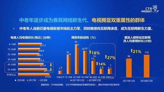 通過調(diào)研發(fā)現(xiàn),中老年將逐漸成為兼具網(wǎng)絡(luò)新生代和電視擁躉雙重屬性的群體。