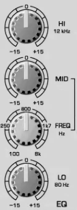 高頻段和低頻段的極限頻率為12千赫茲和80 赫茲。對中頻范圍調(diào)音臺有一個半?yún)?shù)型音質(zhì)調(diào)節(jié),適用于100赫茲至8千赫茲之間。用MID調(diào)節(jié)按鈕提高/下降音量,用FREQ調(diào)節(jié)按鈕調(diào)節(jié)頻率。