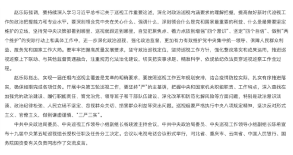 2020年5月10日趙樂際出席全國巡視工作會議暨十九屆中央第五輪巡視動員部署會,新聞通稿如下,大家仔細(xì)看看。