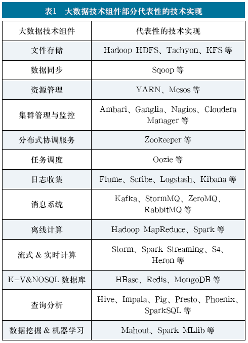 在大數(shù)據(jù)能力中心的構(gòu)建過(guò)程中,應(yīng)依托大數(shù)據(jù)技術(shù)組件、標(biāo)準(zhǔn)和算法等關(guān)鍵要素,形成一套縱向可挖掘、橫向可擴(kuò)展的大數(shù)據(jù)技術(shù)體系架構(gòu),為智慧廣電頂層應(yīng)用打牢技術(shù)基礎(chǔ)。智慧廣電的相關(guān)技術(shù)體系包括人工智能技術(shù)、大數(shù)據(jù)技術(shù)、音視頻技術(shù)、云計(jì)算技術(shù)等。其中,大數(shù)據(jù)技術(shù)一方面基于新一代智能廣電網(wǎng)絡(luò)采集多源異構(gòu)的用戶行為數(shù)據(jù),另一方面為智慧廣電頂層應(yīng)用提供數(shù)據(jù)分析、數(shù)據(jù)挖掘等技術(shù)支撐,同時(shí)為人工智能技術(shù)體系提供海量訓(xùn)練數(shù)據(jù),是智慧廣電技術(shù)體系的重要一環(huán)。目前,大數(shù)據(jù)技術(shù)體系已經(jīng)趨于成熟,其關(guān)鍵的技術(shù)組件主要包括大數(shù)據(jù)的文件存儲(chǔ)、數(shù)據(jù)同步、資源管理、集群管理與監(jiān)控、分布式協(xié)調(diào)服務(wù)、任務(wù)調(diào)度、日志收集、消息系統(tǒng)、離線計(jì)算、流式&實(shí)時(shí)計(jì)算、K-V&NOSQL數(shù)據(jù)庫(kù)、查詢分析、數(shù)據(jù)挖掘&機(jī)器學(xué)習(xí)等等,各個(gè)技術(shù)組件代表性的技術(shù)實(shí)現(xiàn)[4][5]等如表1所示。這些技術(shù)組件涵蓋了大數(shù)據(jù)采集、存儲(chǔ)、清洗、分析、處理,挖掘等全流程各個(gè)環(huán)節(jié),是大數(shù)據(jù)支撐頂層業(yè)務(wù)應(yīng)用的必要基礎(chǔ)。
