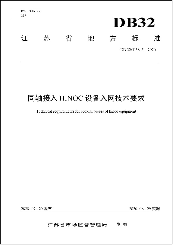 由江蘇省廣播電視局提出、江蘇有線起草的江蘇首個廣電網(wǎng)絡(luò)地方標(biāo)準(zhǔn)——《同軸接入HINOC設(shè)備入網(wǎng)技術(shù)要求》(以下簡稱“標(biāo)準(zhǔn)”),順利通過江蘇省市場監(jiān)督管理局組織的專家評審,現(xiàn)已成功發(fā)布。“標(biāo)準(zhǔn)”編號DB32/T 3845-2020,發(fā)布時間2020年7月29日,實施時間2020年8月29日。