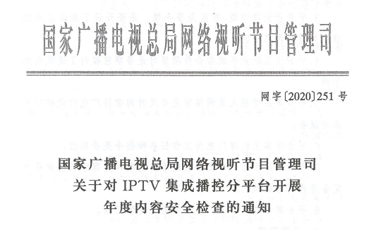 近日,國家廣播電視總局網(wǎng)絡視聽節(jié)目管理司發(fā)布《國家廣播電視總局網(wǎng)絡視聽節(jié)目管理司關于對IPTV集成播控分平臺開展年度內容安全檢查的通知》(網(wǎng)字[2020]251號),要求各省廣電行政部門組織對屬地IPTV集成播控分平臺開展年度內容安全檢查,檢查涉及節(jié)目源管理、內容是否合規(guī)、頻道/專區(qū)是否合規(guī)等多個項目,要求檢查結果按評價體系形成檢查結論——分“良好”“合格”“不合格”三類。檢查結果將按程序予以公示,供相關機構和人員查詢,并作為平臺相關許可證換發(fā)或申領的重要依據(jù)。