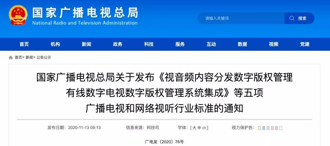 國家廣播電視總局組織審查了《視音頻內(nèi)容分發(fā)數(shù)字版權(quán)管理 有線數(shù)字電視數(shù)字版權(quán)管理系統(tǒng)集成》《視音頻內(nèi)容分發(fā)數(shù)字版權(quán)管理 IPTV 數(shù)字版權(quán)管理系統(tǒng)集成》等五項標(biāo)準(zhǔn)文件,現(xiàn)批準(zhǔn)為中華人民共和國廣播電視和網(wǎng)絡(luò)視聽推薦性行業(yè)標(biāo)準(zhǔn),予以發(fā)布。