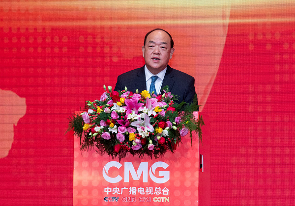 圖為:中宣部副部長、中央廣播電視總臺臺長兼總編輯慎海雄致辭