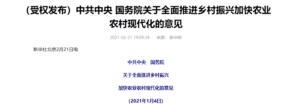 日前,新華網(wǎng)受權(quán)發(fā)布中共中央 國務(wù)院關(guān)于全面推進(jìn)鄉(xiāng)村振興加快農(nóng)業(yè)農(nóng)村現(xiàn)代化的意見,即2021年中央一號文件發(fā)布,文件指出,民族要復(fù)興,鄉(xiāng)村必振興。要堅持把解決好“三農(nóng)”問題作為全黨工作重中之重,把全面推進(jìn)鄉(xiāng)村振興作為實現(xiàn)中華民族偉大復(fù)興的一項重大任務(wù),舉全黨全社會之力加快農(nóng)業(yè)農(nóng)村現(xiàn)代化,讓廣大農(nóng)民過上更加美好的生活。