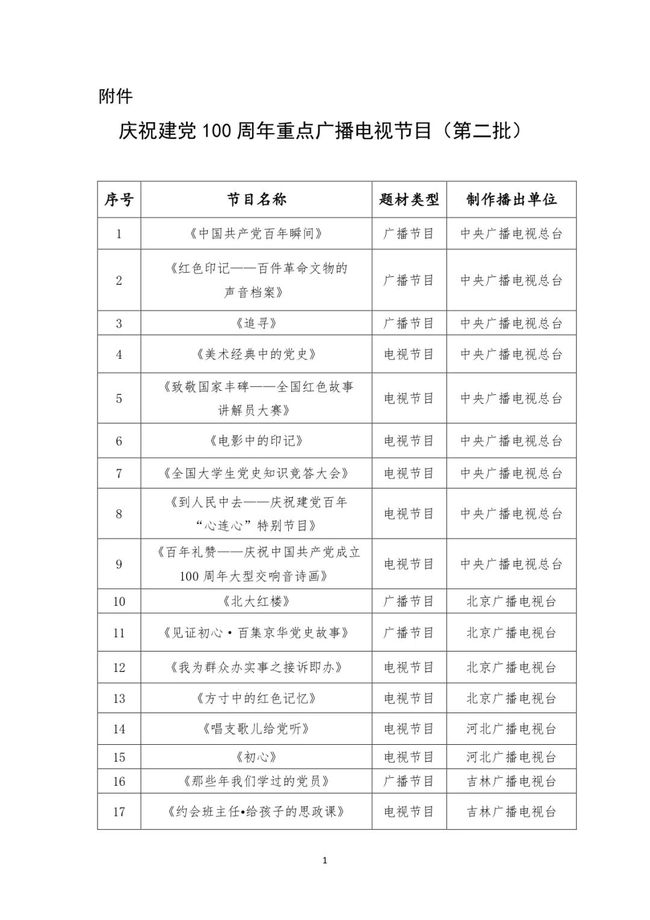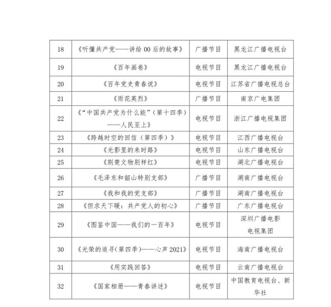 “七一”臨近,慶祝建黨百年氛圍日益濃厚,廣播電視建黨百年主題節(jié)目陸續(xù)播出,產(chǎn)生了良好反響。為進(jìn)一步推進(jìn)慶祝建黨百年主題廣播電視節(jié)目創(chuàng)作播出,廣電總局聚焦主題,從思想內(nèi)涵、構(gòu)思創(chuàng)意、藝術(shù)呈現(xiàn)上擇優(yōu)篩選,確定了《中國共產(chǎn)黨百年瞬間》《美術(shù)經(jīng)典中的黨史》《方寸中的紅色記憶》等32檔慶祝建黨100周年重點廣播電視節(jié)目(片目附后)。
