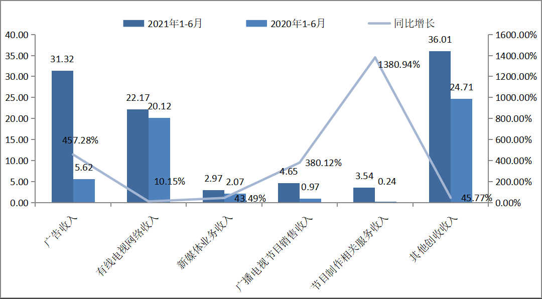 根據今年第二季度福建省廣播電視統計季報數據,截至2021年6月,福建省廣播電視實際創(chuàng)收100.67億元,同比增長86.31%。其中,廣告收入31.32億元,同比增長457.28%;有線電視網絡收入22.17億元,同比增長10.15%;新媒體業(yè)務收入2.97億元,同比增長43.49%;廣播電視節(jié)目銷售收入4.65億元,同比增長380.12%;節(jié)目制作相關服務收入3.54億元,同比增長1380.94%;其他創(chuàng)收收入36.01億元,同比增長45.77%。福建省廣播電視持證節(jié)目制作機構1133家,同比增長47.95%。