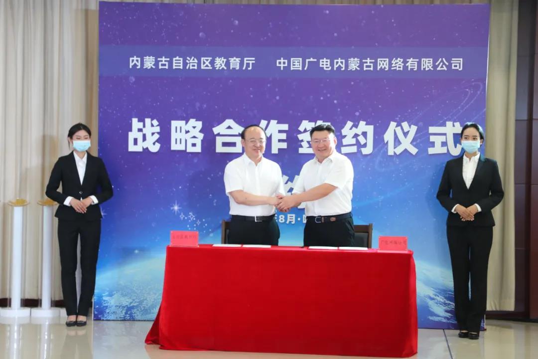 啟動(dòng)儀式現(xiàn)場(chǎng),自治區(qū)教育廳與中國(guó)廣電內(nèi)蒙古網(wǎng)絡(luò)有限公司簽署了教育信息化全面戰(zhàn)略合作協(xié)議,雙方將在宣傳推行使用國(guó)家統(tǒng)編教材、全面提升教育信息化基礎(chǔ)支撐能力、共同構(gòu)建教育內(nèi)容資源體系、推進(jìn)公共教育服務(wù)向農(nóng)牧區(qū)和偏遠(yuǎn)貧困地區(qū)延伸等領(lǐng)域展開全面合作。