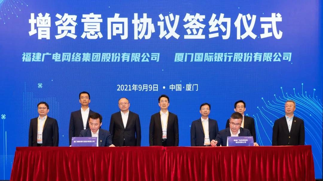 9月9日,福建廣電網(wǎng)絡集團與廈門國際銀行簽訂增資意向協(xié)議,福建廣電網(wǎng)絡集團黨委書記、董事長蔡琳,黨委副書記、總經(jīng)理黃葦洲,廈門國際銀行黨委書記、董事長王曉健,黨委副書記、行長章德春等領導出席簽約儀式。福建廣電網(wǎng)絡集團總會計師方友愛與廈門國際銀行副行長黃大慶代表雙方進行簽約。