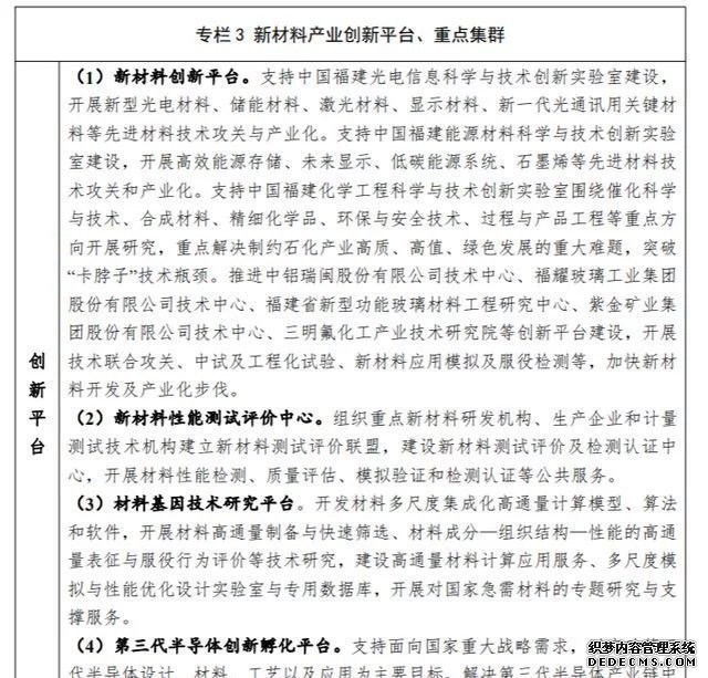 電子信息材料。圍繞集成電路、新型顯示、第三代半導(dǎo)體領(lǐng)域需求,突破一批高端產(chǎn)品生產(chǎn)技術(shù),填補(bǔ)國(guó)內(nèi)空白。圍繞半導(dǎo)體產(chǎn)業(yè)配套需求,發(fā)展光刻膠、高純?cè)噭?、電子氣體、封裝材料等電子專(zhuān)用化學(xué)品。依托中國(guó)科學(xué)院福建物質(zhì)結(jié)構(gòu)研究所,鞏固提升激光晶體、磁光晶體、半導(dǎo)體發(fā)光材料等光電子材料技術(shù)優(yōu)勢(shì)。依托省內(nèi)龍頭企業(yè),發(fā)展以氮化鎵、碳化硅、鈣鈦礦為代表的第三代半導(dǎo)體材料。依托將樂(lè)軍民融合第三代半導(dǎo)體晶體研究中心等創(chuàng)新平臺(tái),研發(fā)、生產(chǎn)第三代寬禁帶半導(dǎo)體晶體材料。