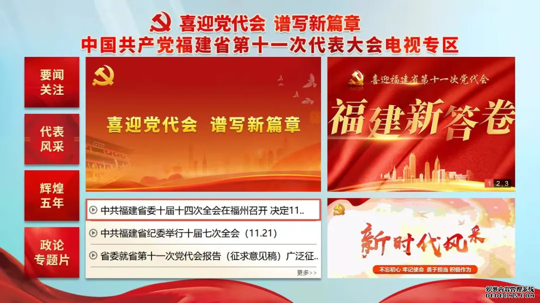 “中國共產(chǎn)黨福建省第十一次代表大會”電視專區(qū),全天24小時更新內(nèi)容,集納省主流媒體的權(quán)威新聞報道和專題節(jié)目,全面薈萃最新資訊,總結(jié)近年來經(jīng)濟社會發(fā)展和黨的建設(shè)等方面的成功實踐,生動呈現(xiàn)新時期的中國故事、福建故事。