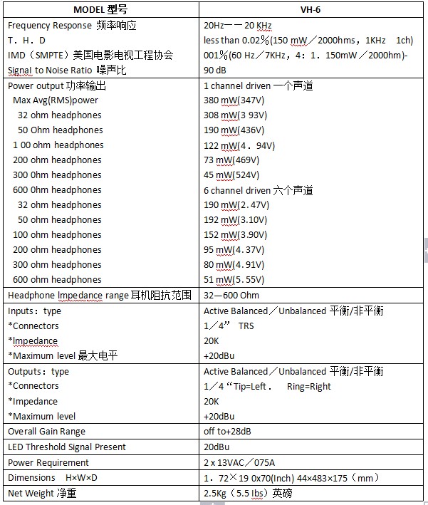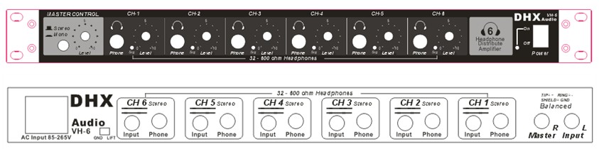 B. VH-6的功率輸出是有限的。連接太多的耳機(jī),每個(gè)耳機(jī)獲得的功率將減少并使VH-6超負(fù)荷。接入10-12個(gè)低阻抗的耳機(jī)VH-6將不堪重負(fù)。為減少VH-6的功率流失,并聯(lián)使用時(shí)請(qǐng)使用高阻抗(100歐姆或更大)的耳機(jī)。參考DHX的提示“了解耳機(jī)功率要求”(從經(jīng)銷商或廠家購買)中的耳機(jī)和響應(yīng)電平。
