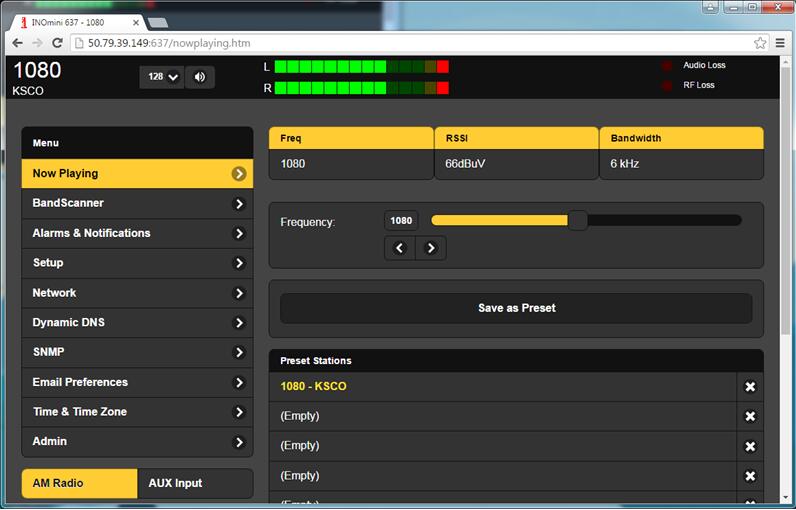 INOmini637是自帶有瀏覽器頁(yè)面的用于遠(yuǎn)程信號(hào)監(jiān)測(cè)的AM信號(hào)接收器。將它部署在發(fā)射機(jī)站點(diǎn)或任何關(guān)鍵地理位置,它能夠收集信息并把無(wú)線電音頻或有線音頻發(fā)送到任何計(jì)算機(jī),平板電腦或移動(dòng)設(shè)備。瀏覽器頁(yè)面能實(shí)現(xiàn)遠(yuǎn)程調(diào)整,顯示音頻電平及數(shù)據(jù),并記錄信號(hào)參數(shù)。參數(shù)和警報(bào)可通過(guò)電子郵件,短信和SNMP協(xié)議發(fā)送。INOmini637還支持滾動(dòng)監(jiān)測(cè)Station Rotation?,能夠遍歷儲(chǔ)存的預(yù)設(shè)并根據(jù)各自的設(shè)定發(fā)送報(bào)警。歡迎前來(lái)體驗(yàn)INOmini637強(qiáng)大的遠(yuǎn)程控制,只需按照在Web瀏覽器此鏈接即可全權(quán)控制一臺(tái)位于美國(guó)加州的儀器:model637.no-ip.org,進(jìn)入網(wǎng)頁(yè)后您將看到如下效果。您也可以點(diǎn)擊播放按鈕來(lái)收聽(tīng)實(shí)時(shí)廣播。