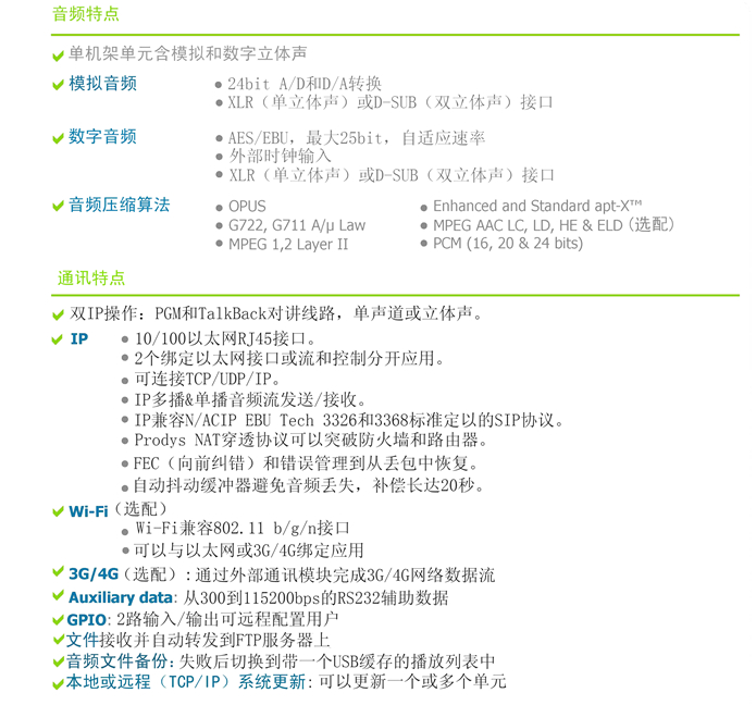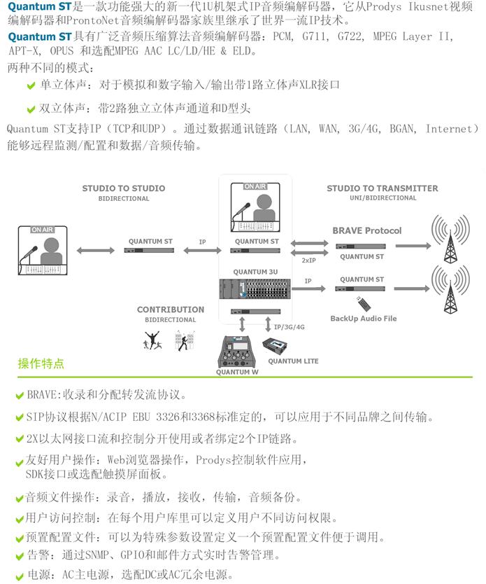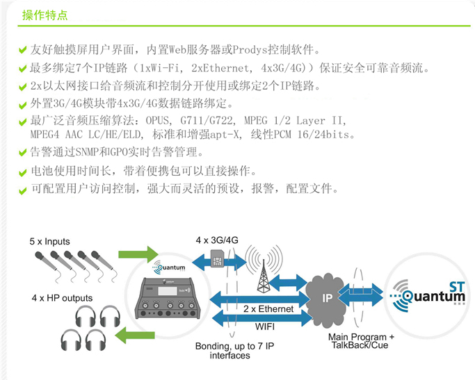 Quantum:從Prodys Ikusnet視頻解碼器家族繼承了世界一流IP技術:自動抖動緩沖、自適應比特率、綁定7個IP鏈路(以太網(wǎng)、3G/4G、Wi-Fi)保證最佳音頻質量。