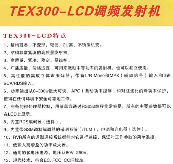 產(chǎn)品簡介:TEX300LCD 300W一體化調頻發(fā)射機