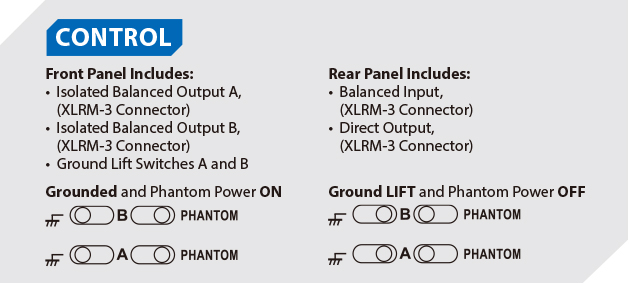 線路分配器的每一通道均分別設(shè)有三組輸出:1 組直接輸出、2 組變壓器隔離輸出、而該 2 組變壓器隔離輸出 (A及B) 亦同樣設(shè)有地線分離選擇開關(guān),可幫助解決因地線回路產(chǎn)生的噪音。將開關(guān)推向左時(shí),地線會(huì)設(shè)定分離;而將開關(guān)向右時(shí),地線將會(huì)設(shè)定為連接。